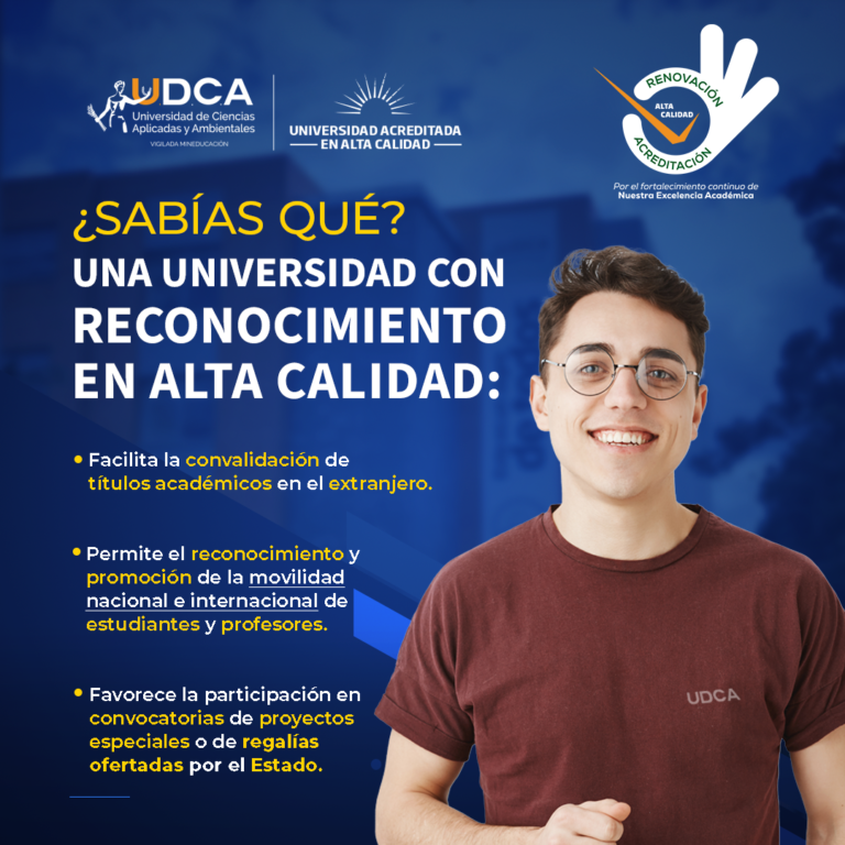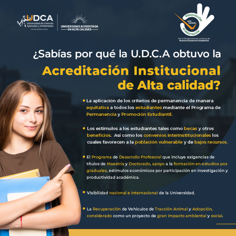 En el marco del proceso de la Renovación de la Acreditación, la Universidad de Ciencias Aplicadas y Ambientales – U.D.C.A te invita a conocer las ventajas y los beneficios de ser una Institución Acreditada en Alta Calidad.