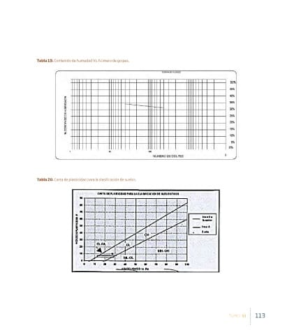 Tabla 19. Contenido de humedad Vs. Número de golpes. Tabla 20. Carta de plasticidad para la clasificación de suelos. TOMO VI 113